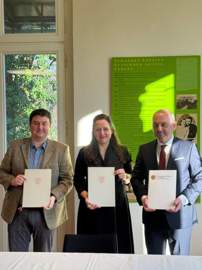 - Erschienen am - PresemitteilungBrandenburgs Kultur- und Wissenschaftsministerin Dr. Manja Schüle, der Botschafter der Republik Armenien in der Bundesrepublik Deutschland, S. E. Viktor Yengibaryan, und der Leiter des Lepsiushauses, Dr. Roy Knocke, haben heute im Lepsiushaus in Potsdam ein Memorandum zur Fortführung des Forschungsprojekts „Deutsche Täter und Helfer im Osmanischen Reich: Erinnerungen und Erzählungen in armenischsprachigen Quellen / aus armenischer Perspektive“ unterzeichnet. Das Forschungsprojekt des Lepsiushauses wird vom Land Brandenburg und von der Republik Armenien in den Jahren 2026 und 2027 mit insgesamt 30.000 Euro gefördert. Es soll in ein Buch münden, das auch im Schulunterricht genutzt werden kann.